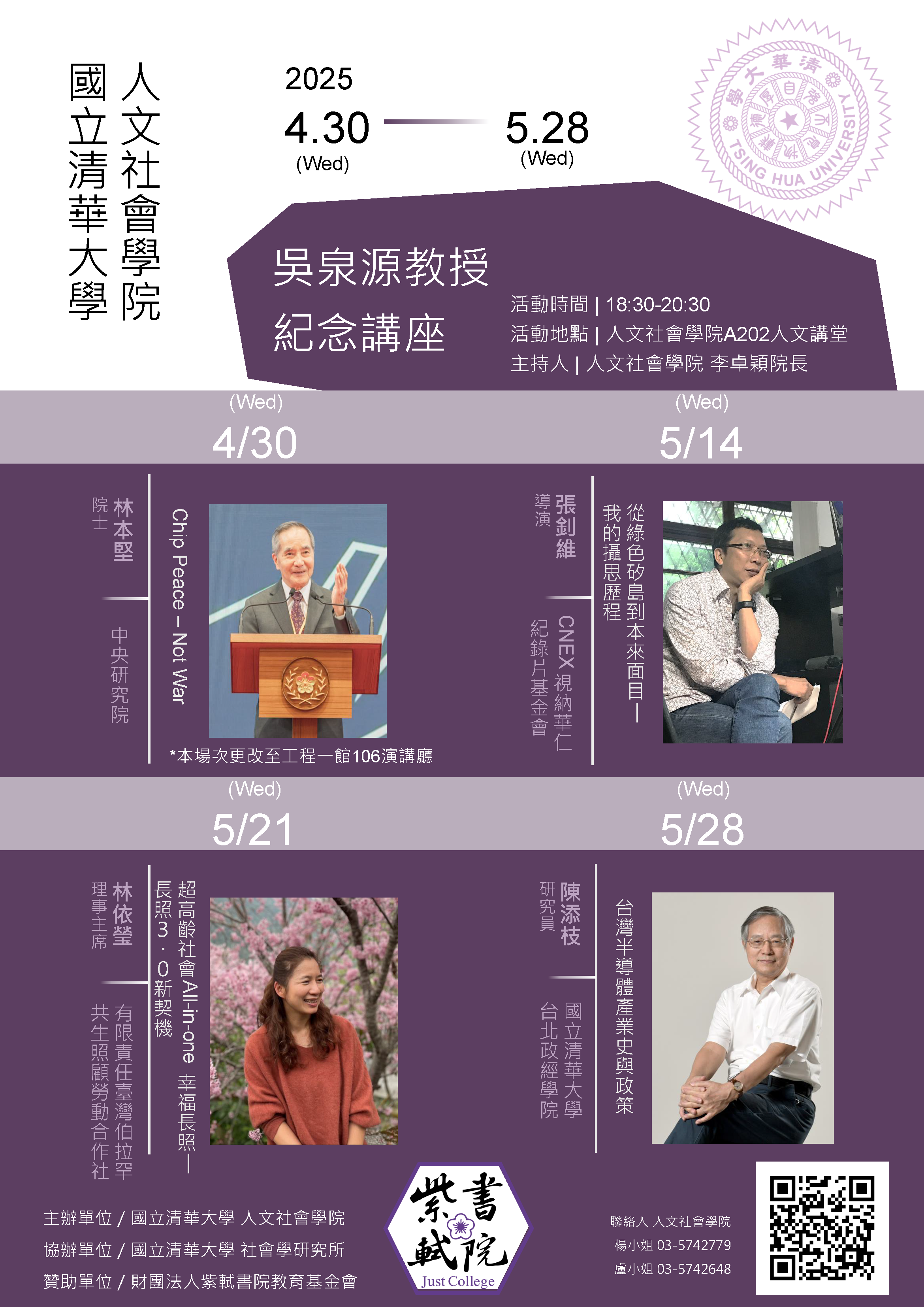 【演講】國立清華大學人文社會學院吳泉源教授紀念講座:4/30、5/14、5/21、5/28